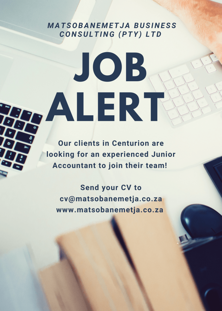 Job AlertPosition: Junior AccountantOur client in Centurion has the above-mentioned position open. Permanent